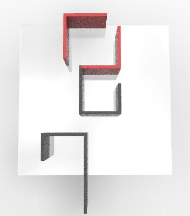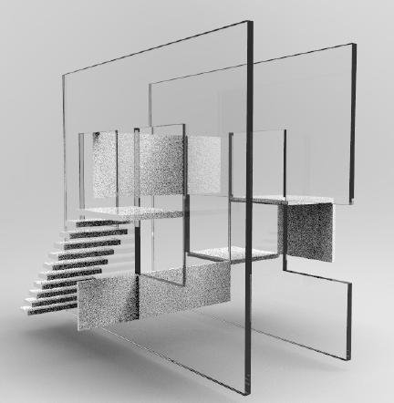 The planes removed from the sides were scattered in a glass box. Thus the black cube is slowly shattering and slowly the red cube comes closer to it from infinity.