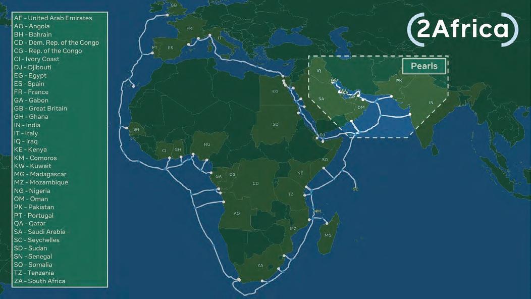 International, Meta, MTN GlobalConnect, Orange, STC, TelecomEgypt,Vodafone,andWIOCC,wouldbelandingthe 2Africa cable in Marseille, France. 2Africa, which is touted to bethelargestsubseacableprojectintheworld,isexpectedto connect 33 countries from 2023, delivering faster & more reliable internet service to each country. It lands and links three continents: Africa, Europe and Asia. The arrival in Marseille follows successful European landings in Genoa,