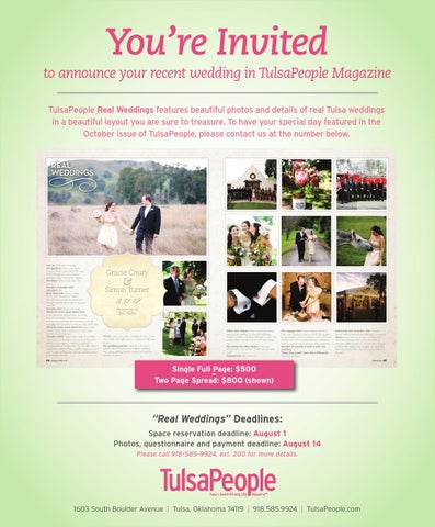 You’re Invited to announce your recent wedding in TulsaPeople Magazine TulsaPeople Real Weddings features beautiful photos and details of real Tulsa weddings in a beautiful layout you are sure to treasure. To have your special day featured in the October issue of TulsaPeople, please contact us at the number below. REAL WEDDINGS