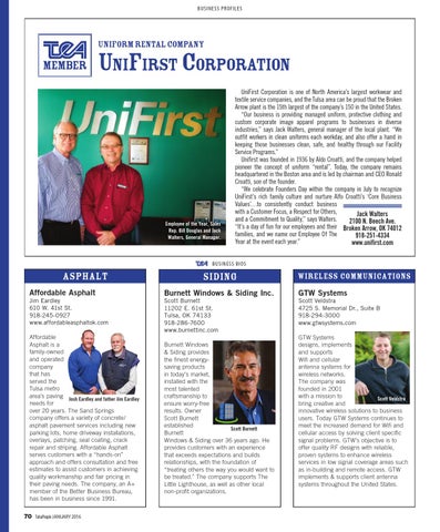UniFirst Corporation is one of North America’s largest workwear and textile service companies, and the Tulsa area can be proud that the Broken Arrow plant is the 15th largest of the company’s 150 in the United States. “Our business is providing managed uniform, protective clothing and custom corporate image apparel programs to businesses in diverse industries,” says Jack Walters, general manager of the local plant. “We outfit workers in clean uniforms each workday, and also offer a hand in keeping those businesses clean, safe, and healthy through our Facility Service Programs.” Unifirst was founded in 1936 by Aldo Croatti, and the company helped pioneer the concept of uniform “rental”. Today, the company remains headquartered in the Boston area and is led by chairman and CEO Ronald Croatti, son of the founder. “We celebrate Founders Day within the company in July to recognize UniFirst’s rich family culture and nurture Alfo Croatti’s ‘Core Business Values’…to consistently conduct business with a Customer Focus, a Respect for Others, Jack Walters and a Commitment to Quality,” says Walters. 2100 N. Beech Ave. “It’s a day of fun for our employees and their Broken Arrow, OK 74012 families, and we name our Employee Of The 918-251-4334 Year at the event each year.” www.unifirst.com