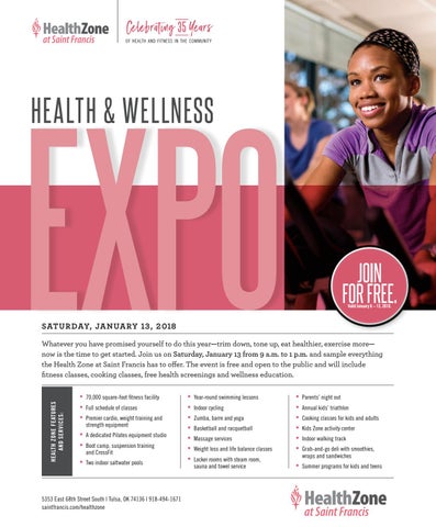 Whatever you have promised yourself to do this year—trim down, tone up, eat healthier, exercise more— now is the time to get started. Join us on Saturday, January 13 from 9 a.m. to 1 p.m. and sample everything the Health Zone at Saint Francis has to offer. The event is free and open to the public and will include fitness classes, cooking classes, free health screenings and wellness education. • 70,000 square-foot fitness facility