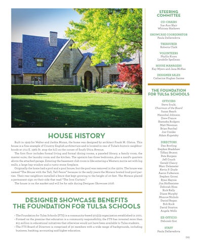 DESIGNER SHOWCASE BENEFITS THE FOUNDATION FOR TULSA SCHOOLS • The Foundation for Tulsa Schools (FTS) is a community-based 501(c)3 organization established in 2001. • Formed on the premise that education is a community responsibility, the FTS has invested more than $15 million in educational initiatives that otherwise would not have been available to Tulsa students. • The FTS Board of Directors is comprised of 30 members with a wide range of backgrounds, including business, banking, accounting and higher education.