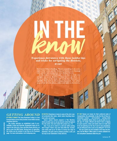 BY BICYCLE Downtown is home to some of the city’s newest protected bike lanes, which make bicycling downtown safer and easier. Tulsa’s newest bicycle program is This Machine, which provides pay-as-you-go bicycle rental throughout the city center. See more about this project on p. 16. And, if you are in need of a cold one while cycling, don’t forget T-Town’s very own Tulsa Bike Bar. Customized routes take up to 16 riders to various bar stops in downtown. The pub crawl on wheels provides a safe, yet fun way to tour downtown’s lively districts.