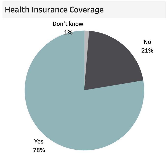 Health Insurance - 78% of respondents have health insurance, while 21% do not, and 1% are unsure. Among those with coverage, 44% receive it from their current or former employer, 25% are covered by government programs like Medicaid or Medicare, 14% through a family member or their employer, and 11% pay for private policies. Additionally, 5% have other forms of coverage.