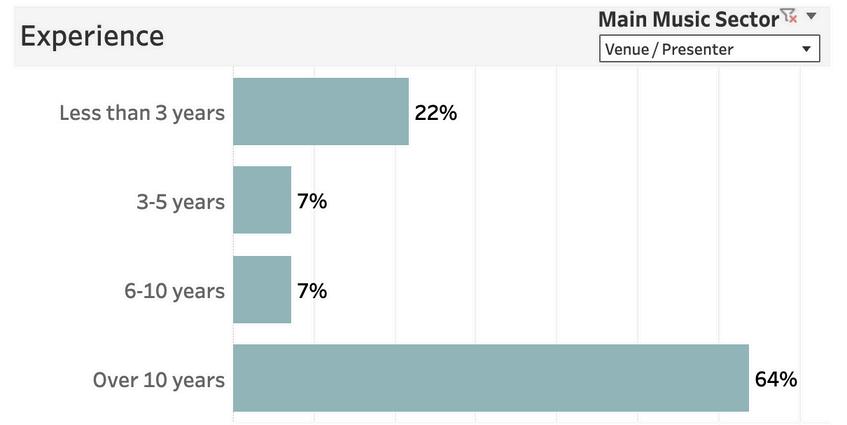 Industry Occupation - The majority of respondents work as event/venue workers (21%), followed by roles in music marketing (16%) and music development (13%) Production support (12%) and music media (9%) are also notable occupations Other roles include recording (7%), agents and business services (5%), label/distribution (4%), music publishing (4%), and public sector (4%)