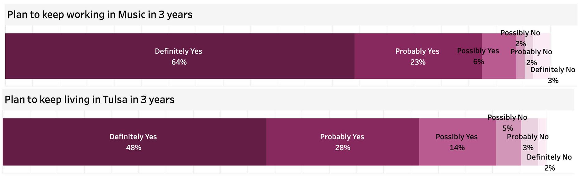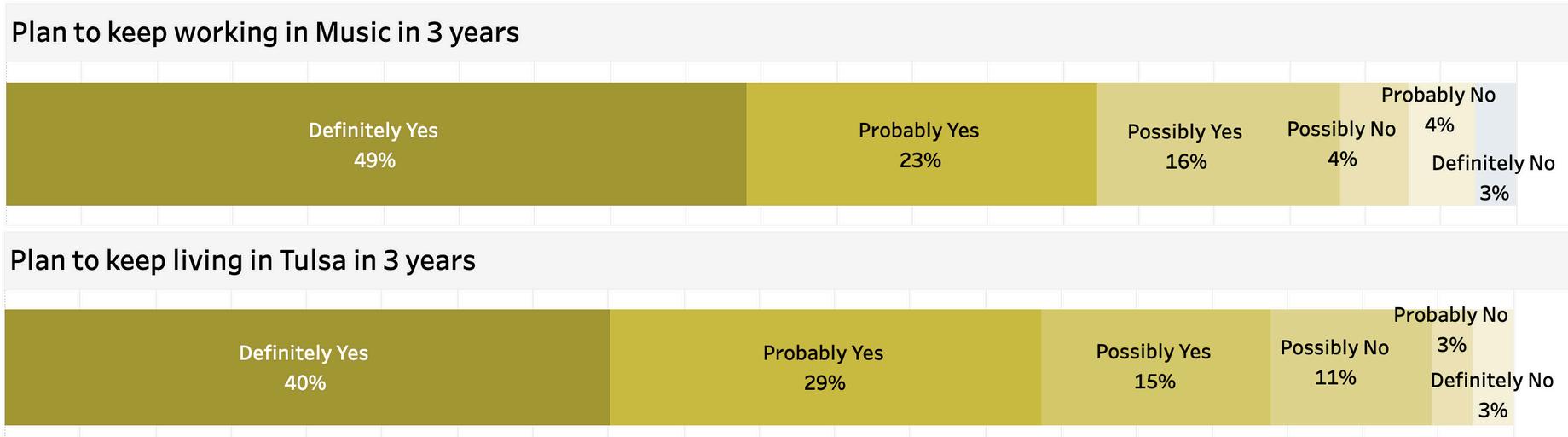43% of respondents work in another creative field Valuable initiatives include more varied venue sizes (63%) and recorded music assistance (64%) To stimulate local audience interest, 86% believe increasing awareness is crucial, followed by more local music in public spaces (79%) Tulsa's music community demonstrates a strong interest in professional development, particularly in booking, event production, and marketing strategies