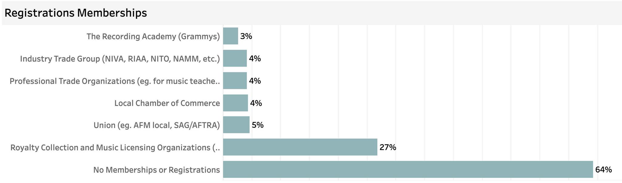 Professional Industry Associations - A significant majority of respondents (64%) have no memberships or registrations with professional organizations. Among those who do, 27% are part of royalty collection and music licensing organizations. Only 3% are members of The Recording Academy (Grammys).