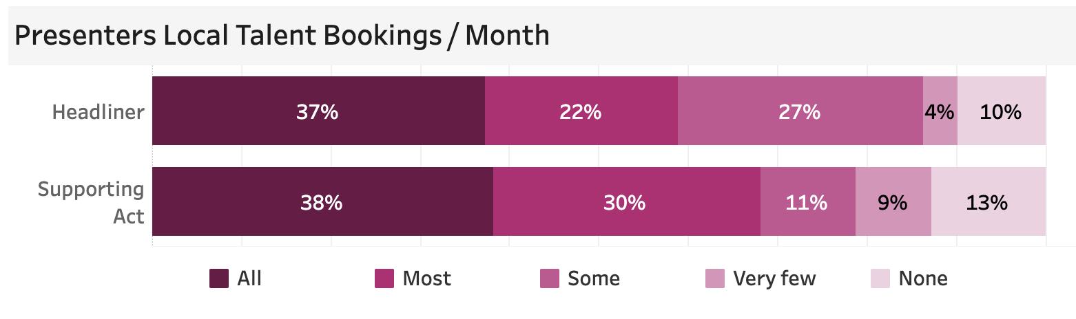 Venue/Presenter - Respondents average 51 events per year for a total of 3,028 events annually. 57% feature local headliners, and 68% book all or most local acts as headliner support