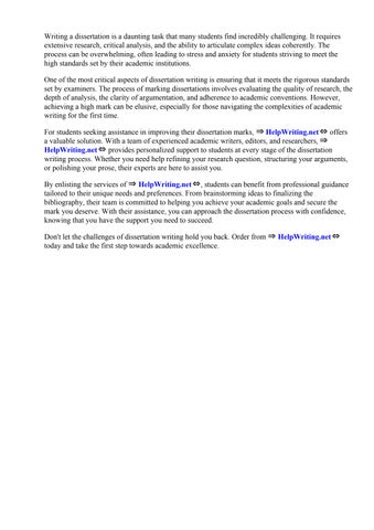 By enlisting the services of ⇒ HelpWriting.net⇔, students can benefit from professional guidance tailored to their unique needs and preferences. From brainstorming ideas to finalizing the bibliography, their team is committed to helping you achieve your academic goals and secure the mark you deserve. With their assistance, you can approach the dissertation process with confidence, knowing that you have the support you need to succeed.