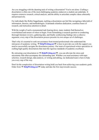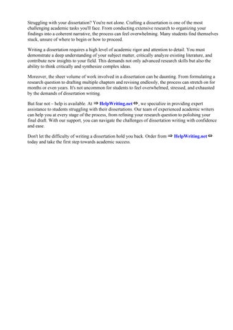 By entrusting your dissertation to ⇒ HelpWriting.net⇔, you can alleviate the stress and uncertainty associated with this demanding task. Our writers will work closely with you to understand your unique research objectives and ensure that your dissertation is tailored to your specific needs and preferences.