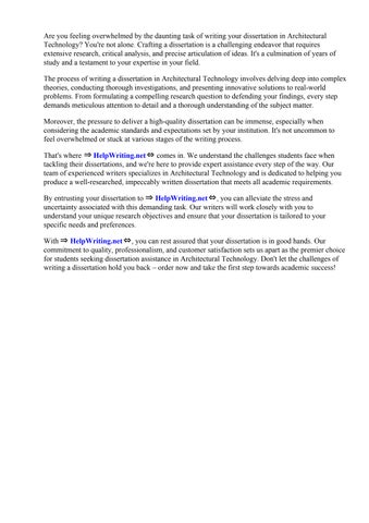 That's where ⇒ HelpWriting.net⇔ comes in. We understand the challenges students face when tackling their dissertations, and we're here to provide expert assistance every step of the way. Our team of experienced writers specializes in Architectural Technology and is dedicated to helping you produce a well-researched, impeccably written dissertation that meets all academic requirements.