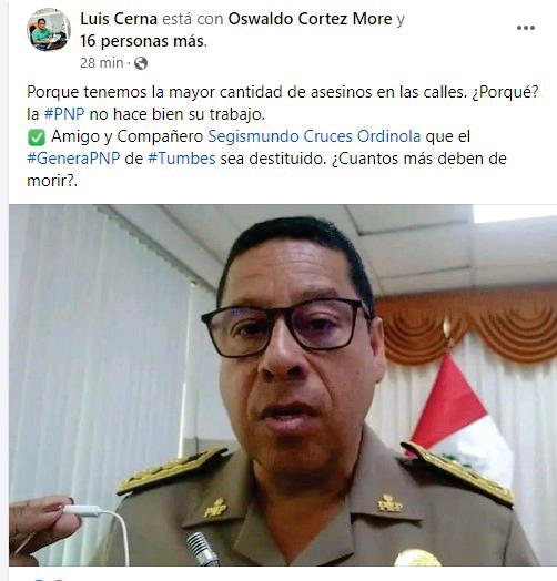 solicitó al Gobernador Regional el cambio inmediato del jefe del Frente Policial, Gral PNP Javier Gonzales Novoa. En un llamado directo a su "amigo y compañeroSegismundo Cruces Ordinola", pidió la destitución del General PNP de Tumbes.