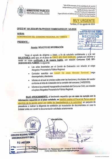 La scal Erika Solís Casto, quien rma el o cio fechado el 01 de agosto, brindó un plazo de cinco días hábiles para que el Gobierno regional remita la siguiente documentación: las actas levantadas por el Comité de Evaluación con relación al cargo de Abogados Procuraduría Pública Regional.
