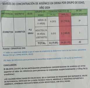 Según los análisis de orina realizados, 31 niños, de 39 que participaron, tienen concentraciones de arsénico inorgánico superiores a 20 microgramos por gramo de creatinina (20 µg/g), cuando el valor de referencia debe ser menor a la cifra señalada (<20 µg/g) para personas no expuestas ocupacionalmente.