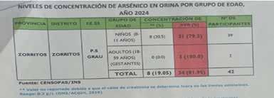 “Es urgente llevar a cabo dosajes de orina semestralmente para medir las concentraciones de arsénico. La falta de estos controles pone en mani esto la falta de atención e indolencia por parte de los gobiernos locales, regionales y nacional. Las embarazadas y sus hijos recién nacidos también deben ser examinados regularmente para descartar posibles intoxicaciones crónicas”, a rmó.