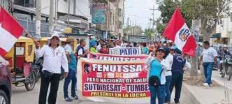 Trabajadores del sector salud en Tumbes continúan ejerciendo su derecho a la protesta desde hace dos semanas. Las acciones iniciaron el pasado 17 de julio, con un paro de 48 horas, seguido por otro de 72 horas, los días 22, 24 y 25 de julio, y desde el 26 de julio, se encuentran en huelga inde nida. Esta medida responde a la falta