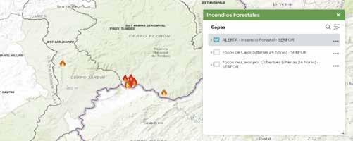 “Mientras que cuando detectamos incendios en Cerros de Amotape, asumimos que lo que se está quemando es cobertura boscosa, en la reserva, existe una actividad formal ganadera y para el mantenimiento de los pastos, se realiza la quema de rastrojos. Lo primero que tenemos que hacer es identi car dónde se origina el fuego y superponerlos con las áreas de aprovechamiento de la ganadería. Nuestro equipo asegura que el fuego no pase al bosque colindante”, detalló.