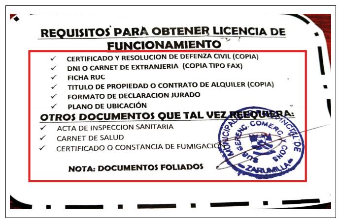 El 27 de diciembre de 2013, la Municipalidad Provincial de Zarumilla emitió la Ordenanza N° 009, en el que se aprobó el Texto Único de Procedimientos Administrativos (T.U.P.A), en que se detalla el procedimiento administrativo y requisitos para el trámite de licencias de funcionamiento.