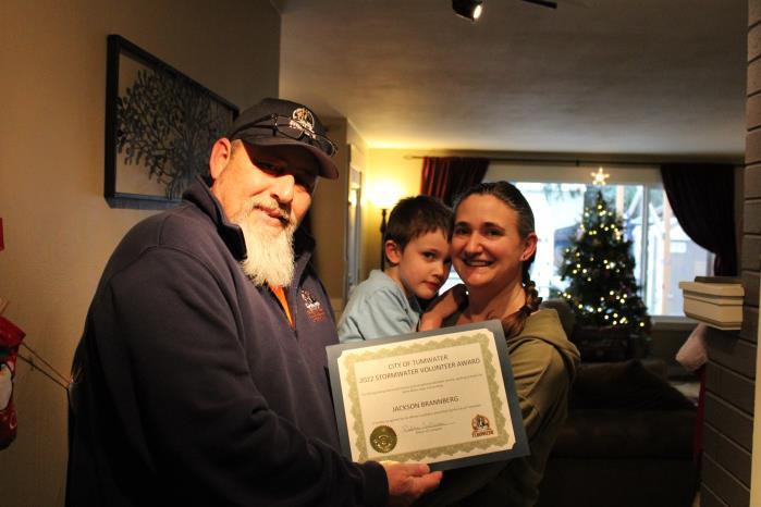 Just before Christmas, Operations staff received a report of a plugged storm drain in a residential neighborhood. Upon inspection, Field Crew Lead Mark Teigen and Maintenance Technician Tim Bell found that the storm system was functioning as designed. During follow-up with the customer, they learned Meghan, and her fiveyear-old son Jackson had taken on the responsibility of keeping their storm drains clear by removing the leaves that collected over them. Mark Teigen saw this as an opportunity to acknowledge Jackson’s efforts and reinforce the positive benefits to the community by presenting him with a Stormwater Volunteer Award and certificate signed by the Mayor. Jackson was very excited to receive the award, and the experience is not one that he will soon forget. Kudos to Mark for recognizing young Jackson’s efforts and creating an ally while promoting a safe and healthy community.