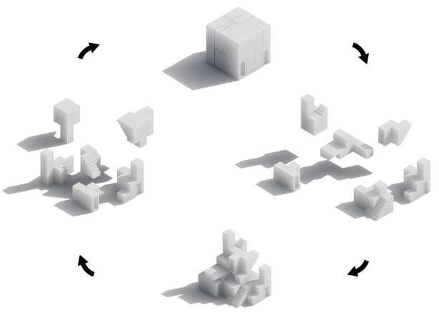This cube, consisting of 6 parts and each containing a component, symbolizes urban mining, which is the architectural method of public luxury. A new structure is obtained by deconstructing this cube, taking it apart and reassembling it with different angles and options. Later, this structure is disintegrated again and reaches another form.