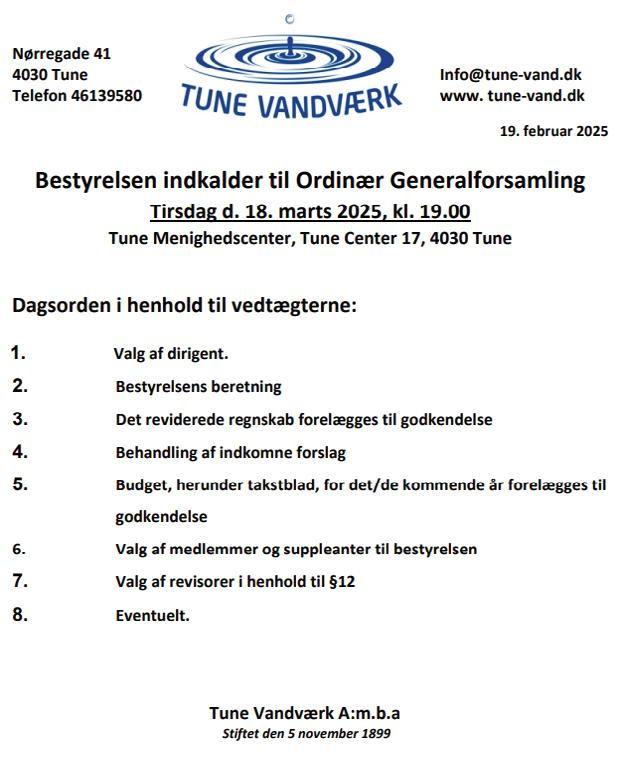 Dagsorden i.h.t. Tune IF´s vedtægter. Forslag kal være formanden i hænde senest 8 dage før generalforsamlingen.