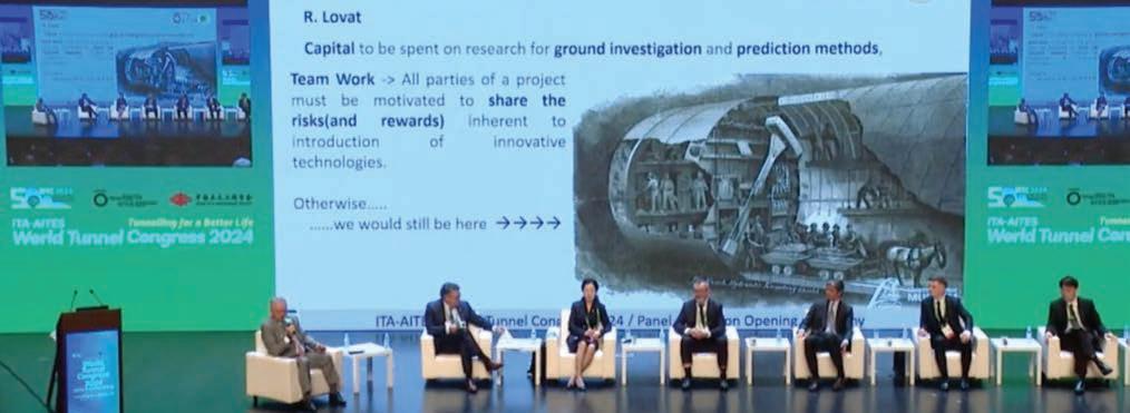 Two plenary discussion sessions explored first (below) the Challenges and Path of Developing Future Tunnelling Technology. Moderated by Andre Assis (far left) of Brazil and a past President of ITA, with panellists (from left) Rick Lovat, Canada; Jenny Jinxiu Yan, China; François Renault, France; Wojciech Mleczko, Poland; and Goh Kok Hun, Singapore, all agreed that introducing new innovations into the industry can only be achieved with team work and that the “team” includes owners and financiers. See Table 1 link to view the Roundtable recording.