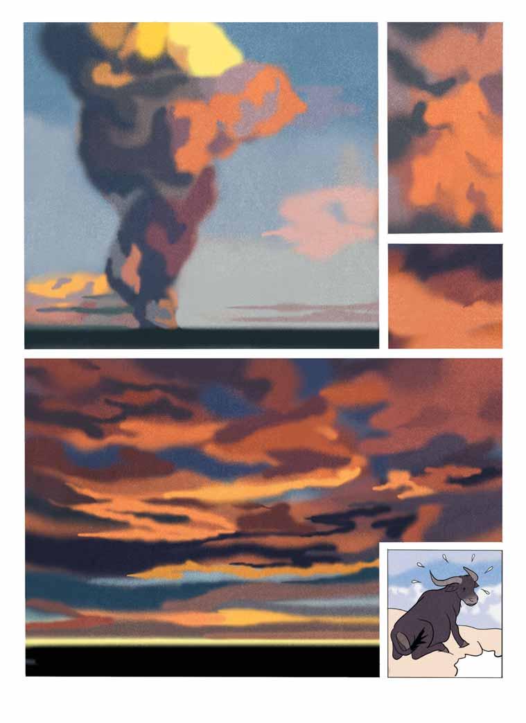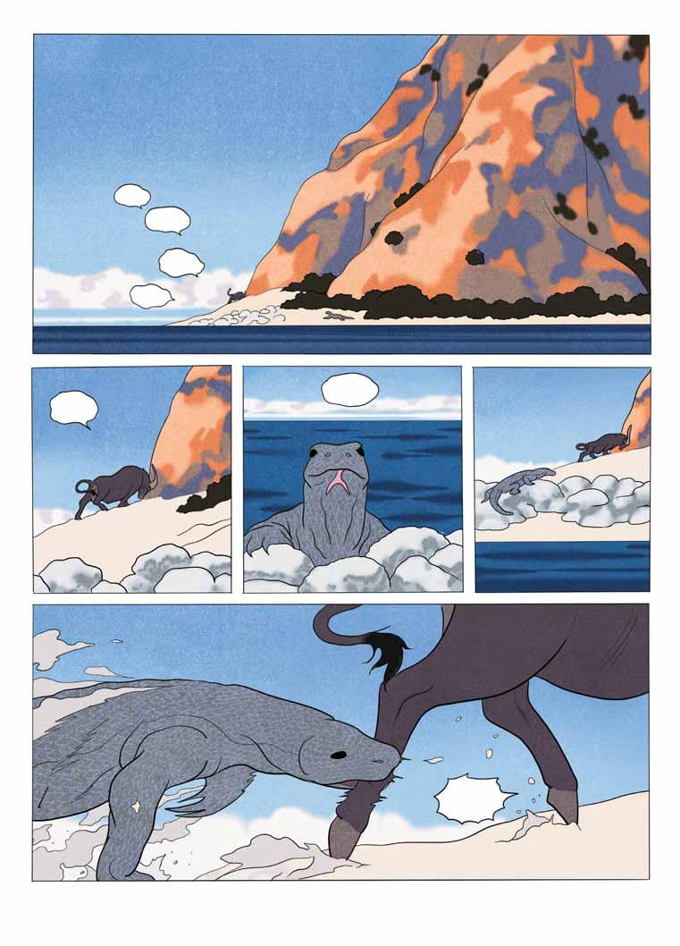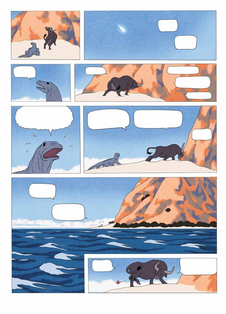 In Il discorso della pantera si respira un altro tipo di straniamento. Gli animali rimangono tali, e quell’anelito umano che riconosciamo in loro è sepolto in profondità ataviche e quindi espresso con parole e sentimenti meno raffinati, nel senso di meno costruiti, in qualche modo più fondativi di un tavolo o di un registro di conti. «Quando amo becchetto. Non posso farne a meno», dice il molesto uccellino ammaliatore alla struzza da cui non vuole che un passaggio. L’animale sta nel non poter fare a meno di becchettare, l’umano nel sentimento d’amore di cui, come di tanti altri sentimenti, ci siamo appropriati. Li abbiamo scelti con superbia come definitori, come il nocciolo minimo e irriducibile di ciò che crediamo sia nostro e ci separi dal (o per meglio dire ci elevi sul) resto dell’esistente. Ma ciò che ritroviamo in quell’uccelletto malevolo, così come nella pietà del varano, nella curiosità dello storno e nella vanità del paguro, non è qualcosa che ci appartiene. Viceversa è qualcosa che ci precede e ci accomuna al mondo animale (in questo caso) e non-umano (più in generale). Questa umanità profonda è presente fin dall’apertura, che istituisce a seguito di un sentimento di pietà il rito della sepoltura, ma si muove via via in superficie fino a emergere nella conclusione circolare. La pantera Sofia esplicita l’ordine del mondo e Homo, non a caso l’animale più vicino all’uomo da un punto di vista evolutivo, rifiuta quell’ordine. Nel dolore del lutto, celebra il corpo della madre in una rappresentazione dalla potenza archetipica che da sola varrebbe a Moreau un posto tra i grandi della narrazione disegnata (e non). È un rifiuto e un’opposizione alla Natura simile a quello di Penss, che sfida il mondo in una lotta in ugual misura di vendetta e di possesso destinata alla rinuncia o al fallimento. «Tu. Mondo… tu. Che permetti una cosa del genere. Me la pagherai», afferma il ragazzo contestualizzando così la sua ricerca dell’agricoltura come qualcosa al di fuori, e anzi in aperto contrasto, a ciò che è Naturale.
