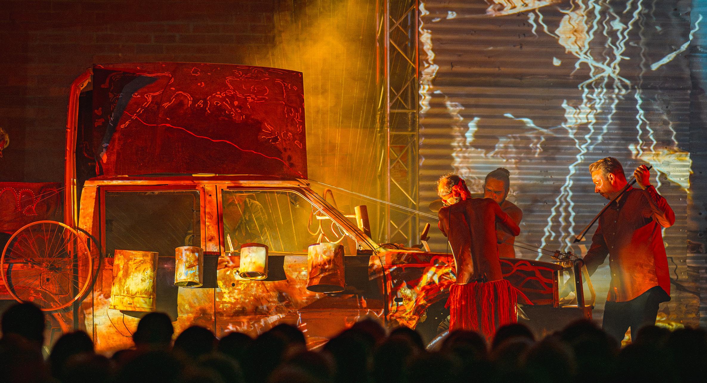 Warnarral Ngoorrngoorrool is now a part of the WA Museum’s permanent collection, and could be seen on display earlier this year as part of Three Journeys at WA Museum Boola Bardip. To celebrate the opening of the exhibition, The Journey Down performers reunited to perform excerpts from the work. As part of the exhibition visitors could watch footage of the tour, and excerpts from the performance projected onto the car, created by video and animation artist Sohan Hayes.