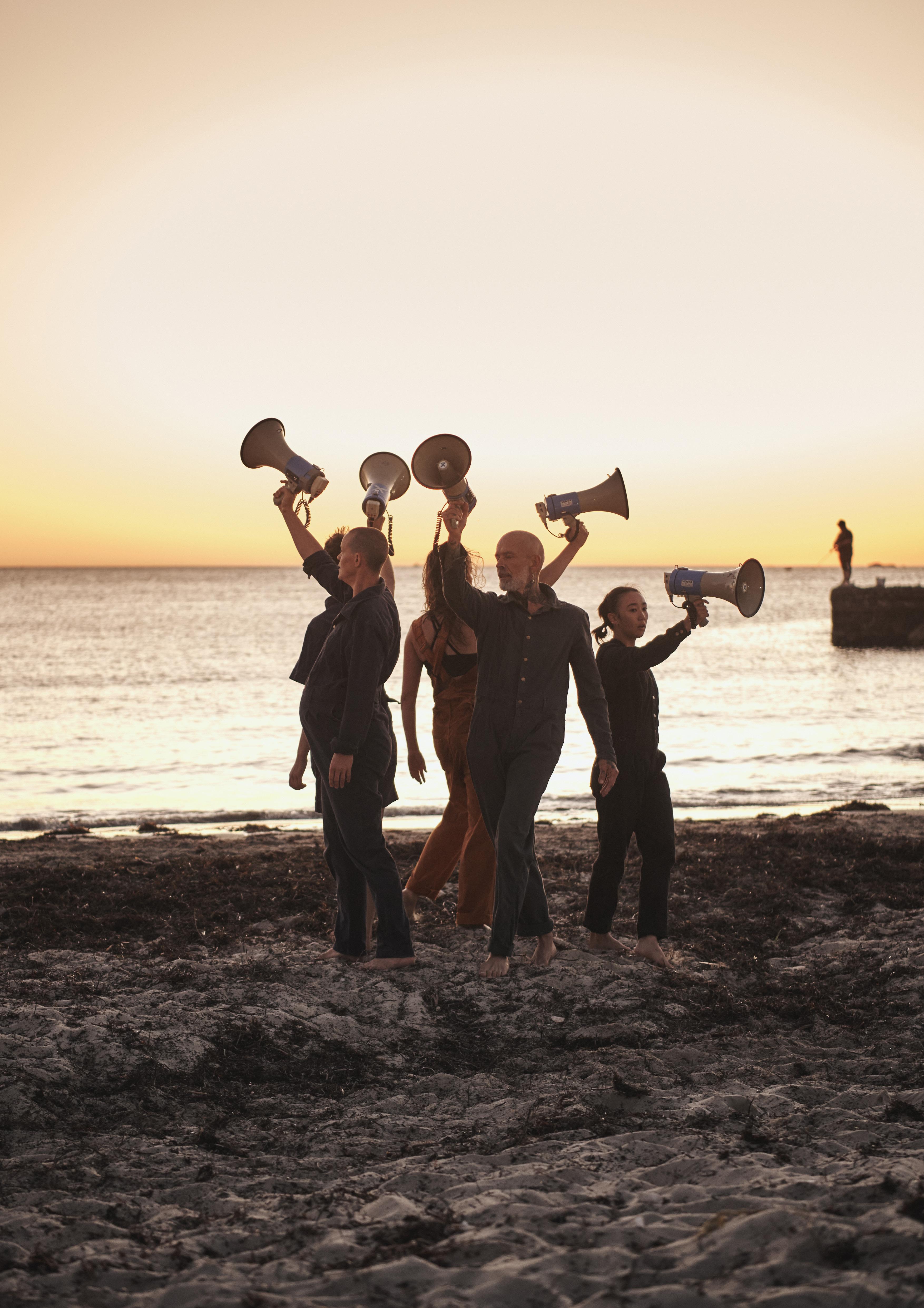 The site-specific work took place at Bathers Beach in Fremantle and gestured to the long histories of human movements and mass protest. Dancers arrived by boat, making their way to shore and performing amongst the sand and rocks that the site provided as a natural theatre. The epic score used speakers and megaphones, providing a sound journey for the work which was performed against the setting sun.
