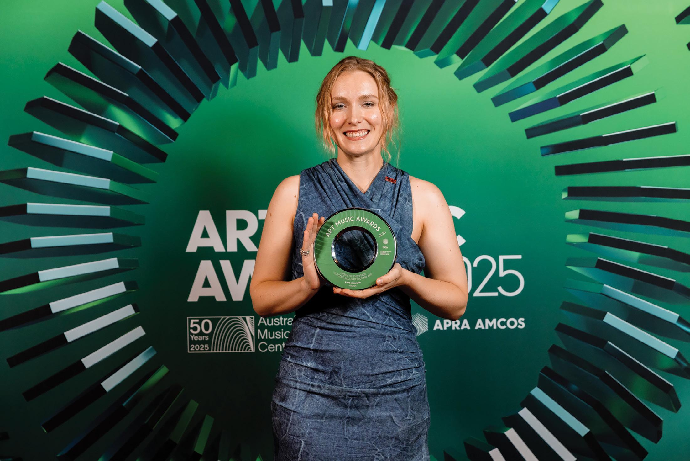 Tactus by Kate Milligan received Work of the Year: Electroacoustic/ Sound Art at the 2025 Art Music Awards, presented by APRA AMCOS in conjunction with the Australian Music Centre. Produced by Tura and performed by Jonty Coy, Tactus is an evocative audiovisual work for renaissance flute and electronics, commissioned through the APRA AMCOS Art Music Fund and created in collaboration with video designer Olivia Davies.