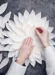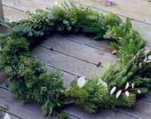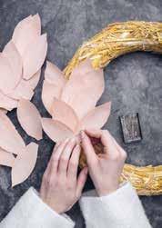 På kransen har vi valgt å teipe en rockering med blomsterteip. Fest små buketter med vintergrønt og eucalyptus hele veien rundt med stålstreng.