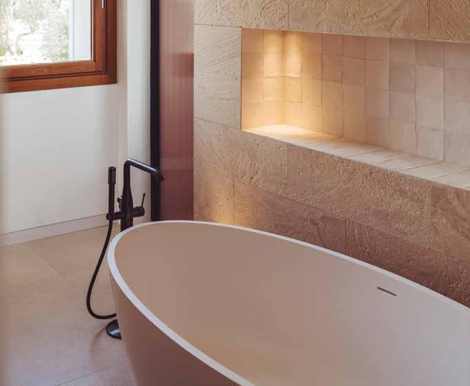 En la habitación principal se sitúa la cama, en el centro, con un doble acceso a ambos lados del vestidor hacia el baño. En el ser vicio encontramos una bañera exenta con una pared de fondo en piedra Santanyí iluminada desde el suelo, creando un punto per fecto de relajación y calma. Para el pavimento se busca incluir un color más rosáceo rebajado para paredes y suelos, acorde con la flor del almendro, muy abundante en el paisaje rural mallorquín.