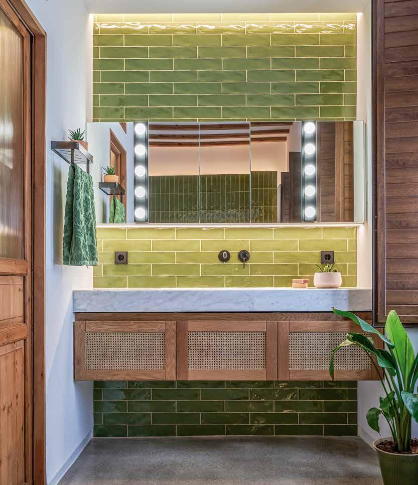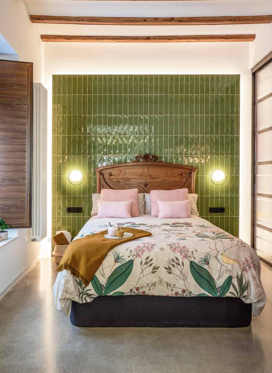 El dormitorio principal incorpora una cómoda y un cabezal modernistas que se enmarca sobre un volumen retroiluminado revestido con cerámica tradicional verde oliva. El baño se integra parcialmente en el dormitorio con un solemne lavabo obtenido de un bloque macizo de mármol blanco de Carrara apomazado inspirado en los lavaderos tradicionales de piedra. El lavabo se apoya sobre un mueble suspendido que emplea de nuevo la rejilla de mimbre natural y se complementa con un contenedor espejado con apliques de camerino. Todo se ha diseñado a medida para el proyecto.