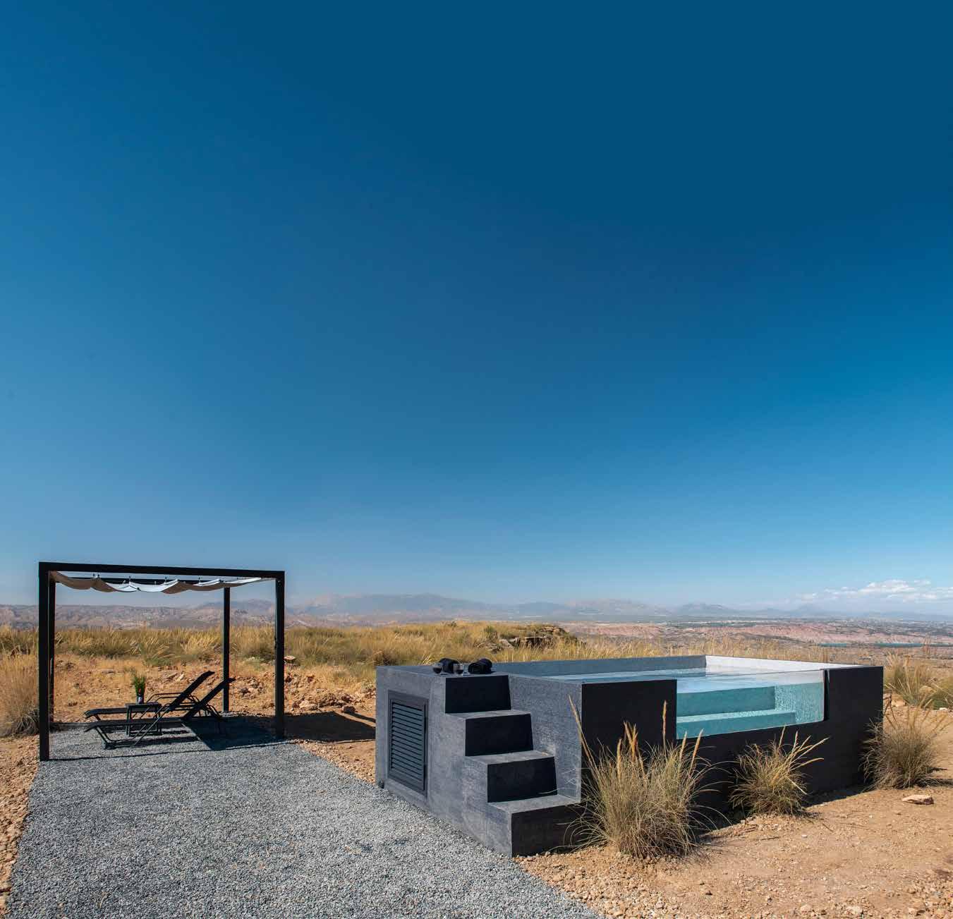 Este podtle (una versión del hotel cápsula transportable) se sitúa en el impresionante geoparque de Gorafe (Granada), uno de los mejores cielos de Europa para ver las estrellas. Rodeado de unas espectaculares vistas, se puede disfrutar de sus nuevas instalaciones: una piscina infinita, una ducha exterior y una zona de lounge con una pérgola y dos tumbonas para descansar y ver el paisaje de día y observar las estrellas de noche.