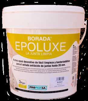 Borada® Epoluxe es un producto bicomponente para el relleno de juntas estancas y/o antiácidas hasta 20 mm de ancho entre piezas cerámicas en cualquier tipo de pavimento o revestimiento, tanto interior como exterior. En cerámicas con microporosidades es recomendable verificar la limpieza o consultar con el Servicio de Asistencia Técnica (SAT). Adecuado para pavimentos y revestimientos residenciales e industriales, expuestos al contacto permanente u ocasional con agentes químicos. Ideal para piezas cerámicas especiales en cocinas, piscinas, aguas termales, duchas, locales comerciales, etc. Gran resistencia al envejecimiento y a las manchas. Total uniformidad de color.
