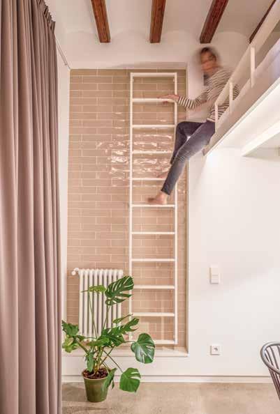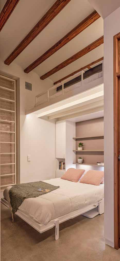 El dormitorio de invitados se cierra con una cortina angular cuando es preciso tener privacidad. Era necesario poder alojar adecuadamente hasta 4 adultos en apenas 7,5 m. Se da solución con una cama abatible con escritorio integrado y se habilita una segunda cama de matrimonio en un espacioso altillo que añade otros 4 m2 a la superficie inicial. El acceso al altillo se hace por una escultural escalera metálica fijada a la pared.