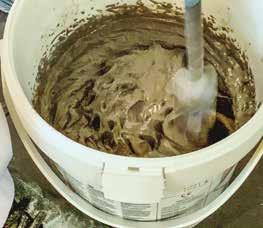 El colocador vertió todo el catalizador (B) en la pasta (A), dejando escurrir totalmente el componente B sobre el A, y con un batidor de aspas epoxi acoplado a un taladro eléctrico mezcló los componentes. Se amasó a bajas revoluciones para que todos los elementos se mezclaran correctamente, pero sobretodo para que no se calentara la masa y que su tiempo de uso fuera más duradero, sobretodo en el caso del rejuntado en obra real, puesto que nos encontrábamos en una temperatura bastante elevada.