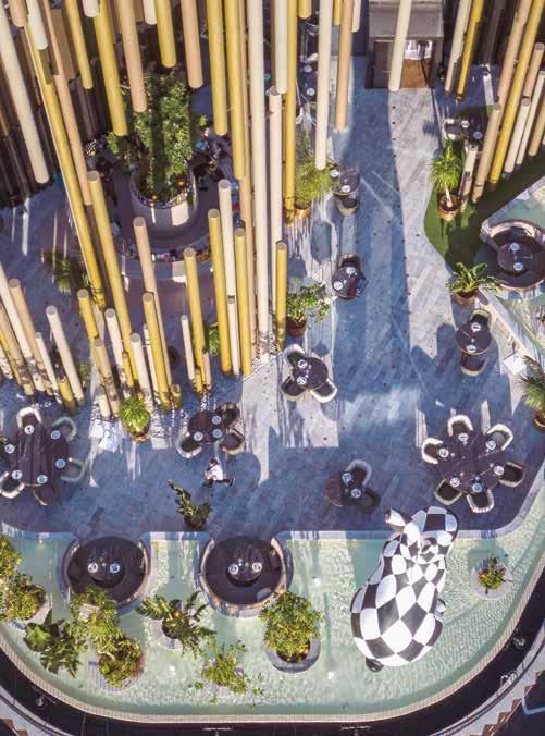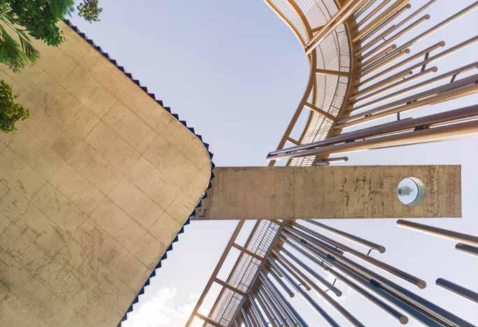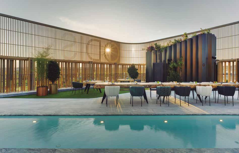 Partiendo de estos preceptos, el edificio se compone exteriormente de un zócalo de dos niveles decalados entre sí, generando en su cubierta una gran terraza donde se dispone un pabellón destinado a restaurante. Por encima aparece el tótem (una gran celosía de tubos metálicos que soportan el rótulo que corona el conjunto) y una terraza elevada atravesada por una piscina en voladizo a ambos lados, que al apoyarse únicamente en dos núcleos centrales de hormigón, genera vuelos de hasta 22 metros de longitud. Un diseño estructural desafiante y complejo, donde recursos estructurales singulares se convierten en convencionales, se utiliza en última instancia para generar un bosque elevado: láminas de agua, vegetación, sombra, ventilación… se combinan para crear un ecosistema que defienda al edificio del fuerte clima de una de las ciudades con más horas de sol de Europa y muy enfocada hacia el turismo.