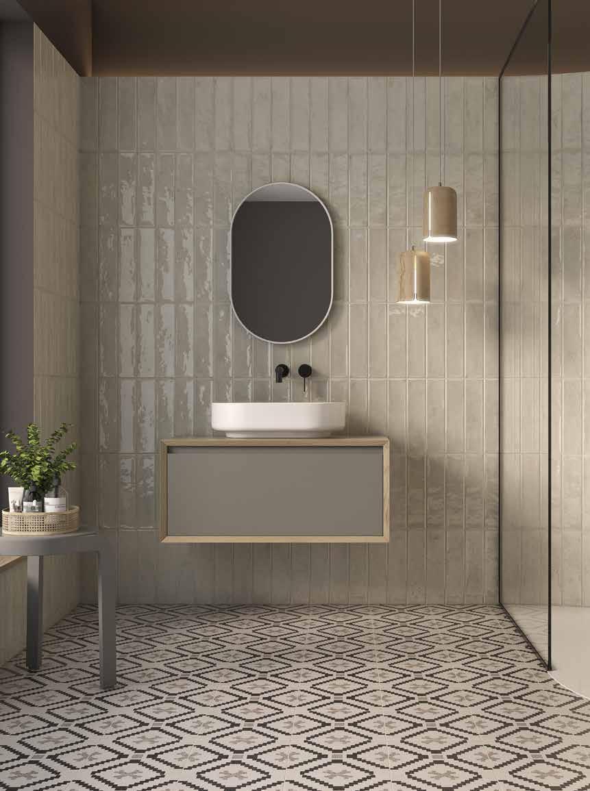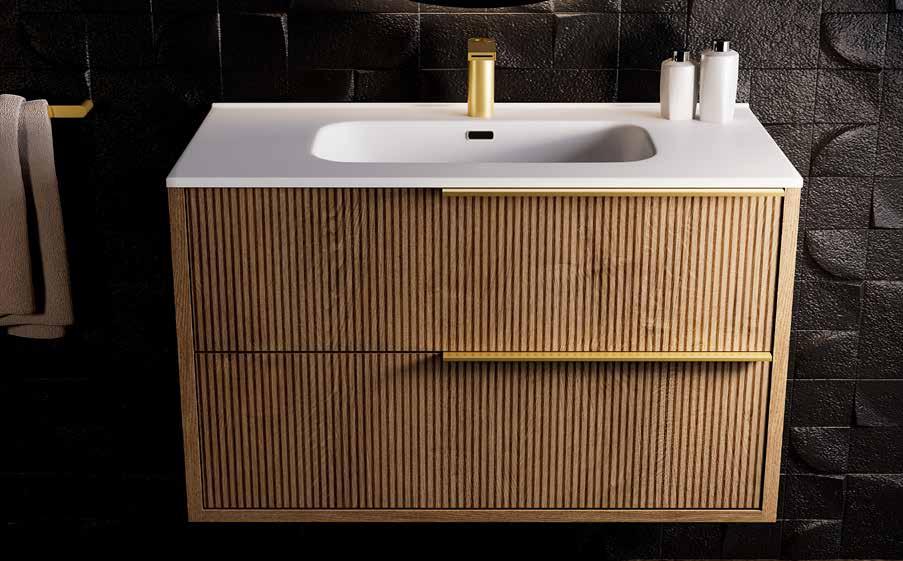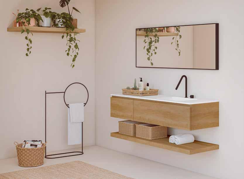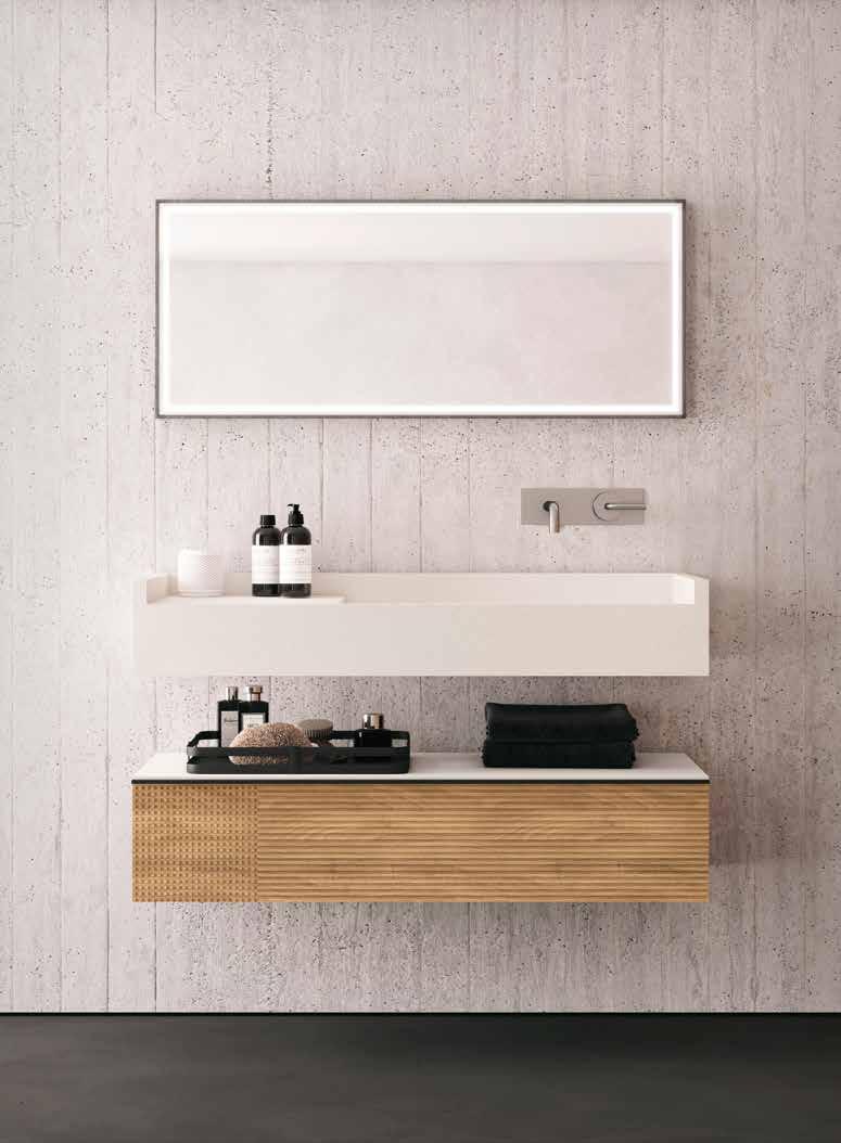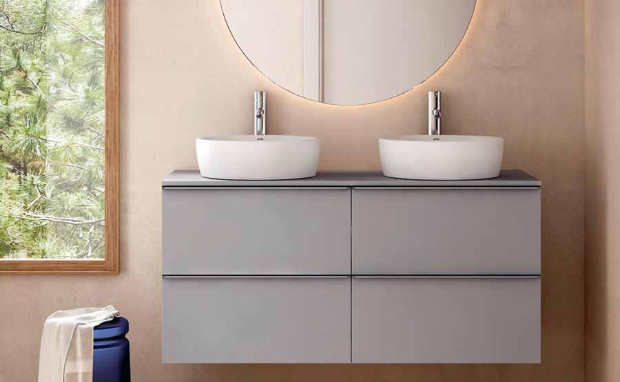 Cada colección se compone de encimera cerámica con seno integrado, base de lavabo suspendida con cajones, espejo, aplique led para espejo y columna auxiliar de almacenaje.