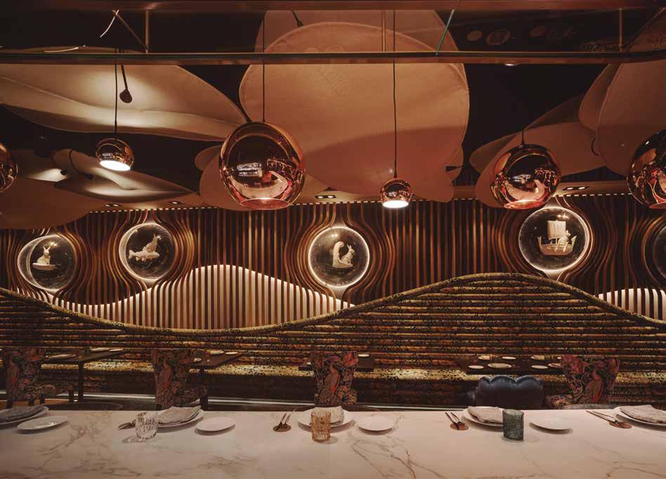 En el interior, un diseño cuidado hasta el extremo genera mundos independientes, yuxtapuestos entre sí, que tienen como punta de lanza el espacio de restaurante. Tomando el Mediterráneo como punto de partida (el cual guía también el trabajo en los fogones) y la mitología griega como su representación más esencial, se recurre a una acumulación de texturas (maderas, dorados y bronces, fibras naturales, terciopelos, cerámicas artesanales…) que,