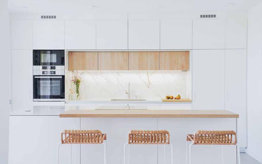 La popularidad del color blanco en el diseño de interiores se asocia con elegancia, ligereza y limpieza. El equipo de diseño de Rekker ha creado una cocina blanca y de madera que combina la luminosidad del blanco con la calidez de la madera. La cocina cuenta con una isla central de mármol que incluye una zona de cocción y almacenamiento adicional, así como una barra de desayuno de madera. La pared frontal está decorada con mármol y armarios bajos de madera con LED continuo. El mobiliario elegido pertenece a la colección REKTO y el resultado es un ambiente equilibrado y armónico.