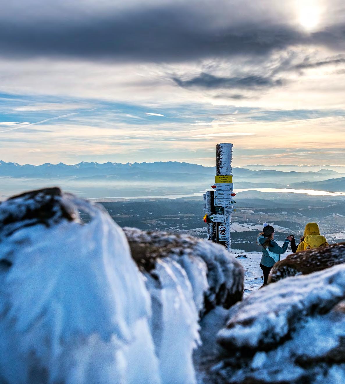 kilátópontjáig. Miközben a vonulat kisebb csúcsait érintjük (Gówniak, 1617 méter és Kępa, 1530 méter), örömmel állapítjuk meg, hogy a szél is jelentősen veszít erejéből, olyannyira, hogy még falatozni és napozni is leülünk, szemünket pedig gondosan „kitisztítjuk”, hiszen a szél és a hó minden körülöttünk található fűszálat és törpenyőt műalkotássá változtatott.
