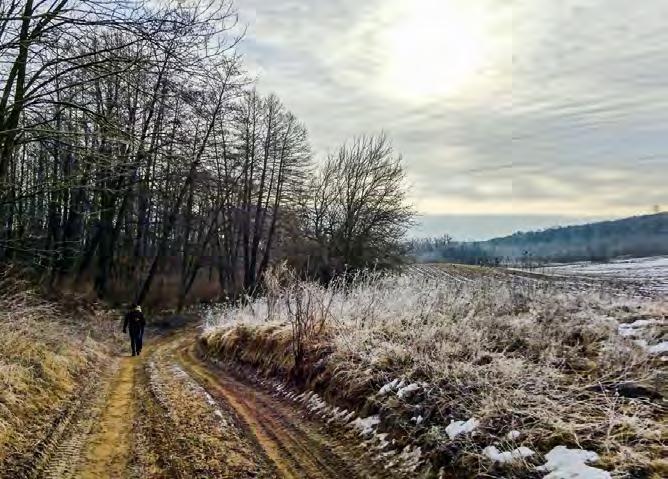 Míg a hegység déli oldalán feljebb húzódik a „hóhatár”, a Kemencepatak zord völgyében nemcsak erős fagy, de hó is fogad bennünket. Nem nagy, de azért hó. A Csóványos felé fordulva pedig már a Magas-Börzsönyben járunk, és én imádom ezt a kifejezést, hiszen olyan hívogató. Azért is kárpáti hangulatú ez a hely, mert hazai szemmel nézve tekintélyes vízhozamú patakok érkeznek a Csóványos északi oldaláról a Kemence-patakba. Nyilván az sem véletlen, hogy a P sáv jelzése egyszer csak – látszólag érthetetlenül – a völgytalpon vezető széles útról egy kicsi, de markáns ösvényre kanyarodik a hegyoldalban. Aztán megértjük ennek okát: a valaha a völgyben zakatoló kisvasút számára épített hidak mára elpusztultak, a patakok pedig valóban bővizűek, a gázlók pedig ennek megfelelően szélesek, főleg így télvíz idején.