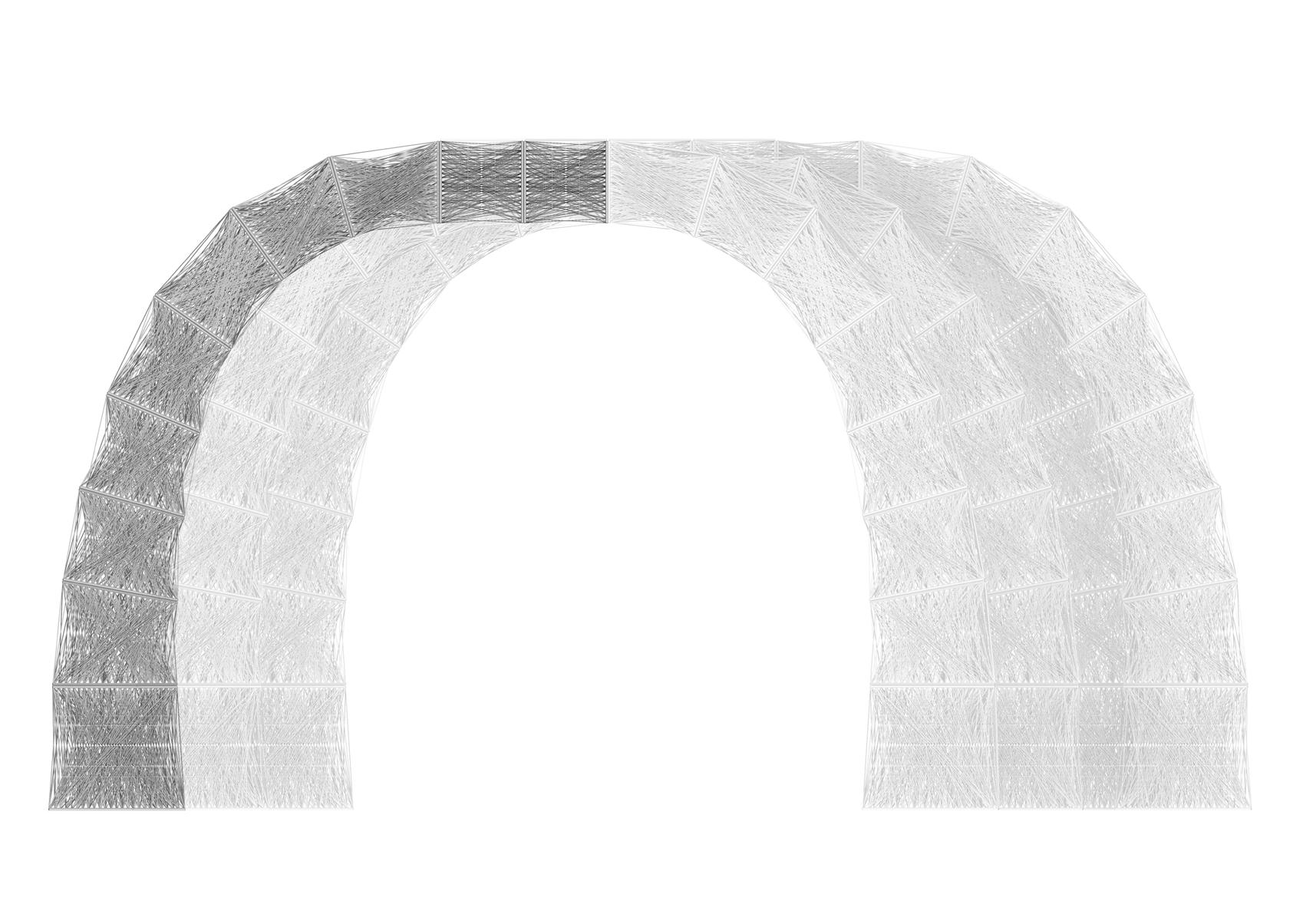 Using darts within the pleats allows for a gradual release of the expansion, so a line is not formed in the structure, making it look like a ballooning is happening. For this project, I chose PVC coated polyester for the fabric. PVC-PES is hard-wearing, durable, highly resistant to weather, has high tensile strength, low flammability fire classification, resists creasing, has high levels of transparency, and can be sprayed with surface coatings to make it dirt resistant. Other coatings can make the surface more stable and help with wind resistance. The warp and weft yarns can be prestressed to add resiliency. The base material is woven high tenacity polyester fabric, and a plasticized PVC coating is applied to both sides.