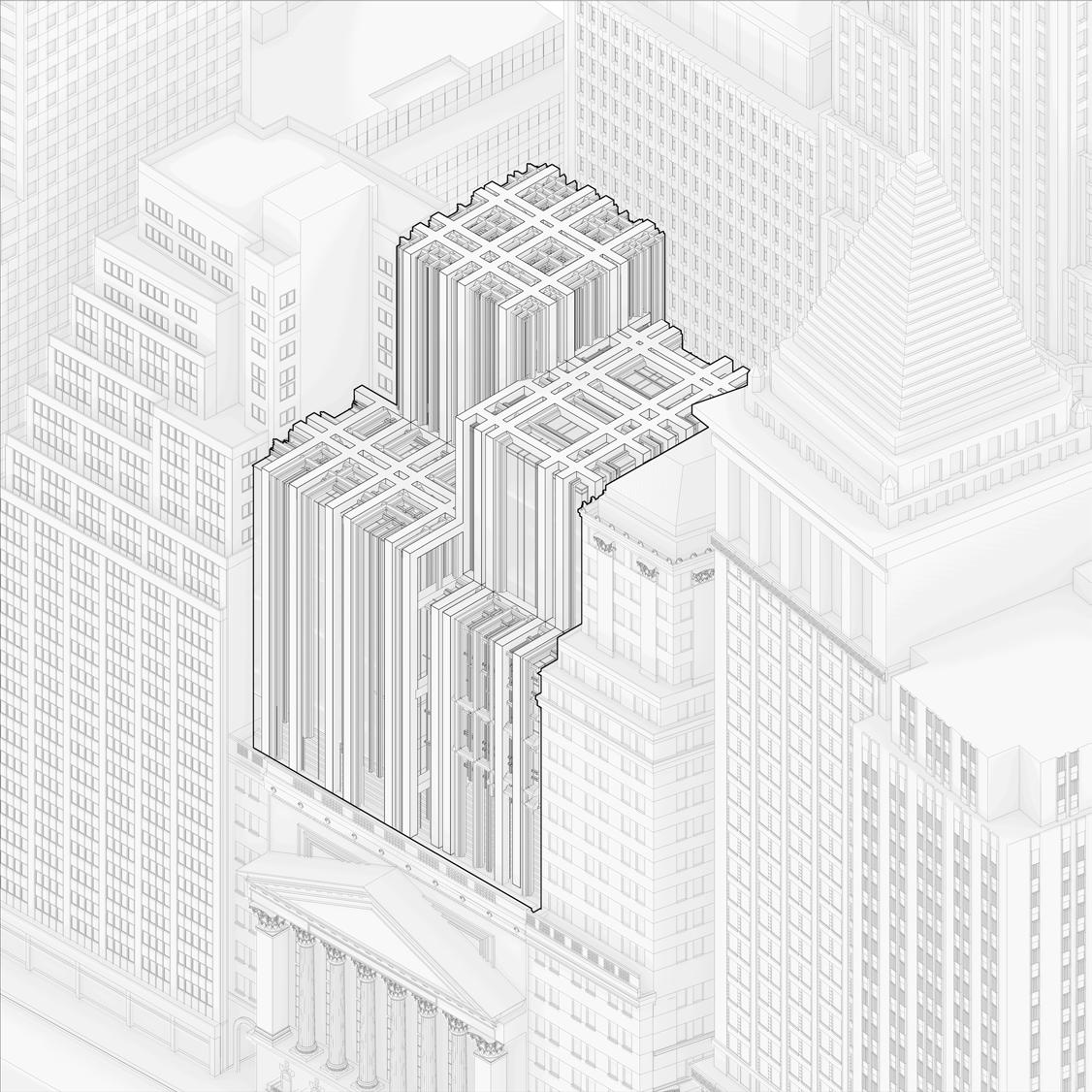 This project speculates that a new typology can help sustain New York City’s global financial leadership in the world. New York cannot solely rely on import and export economies with the uncertainty of political pressures that affect the prices of goods and services. New York and other cities need to reinvent existing networks to be able to compete with trade barriers that are cumbersome and willfully destroy the growth of the global economy while having ramifications on New York City. New York City needs to raise capital as the Federal and State Governments have not helped New York’s finances in any way. If New York City mines Non-Fungible Tokens (NFT’s) that are pegged to Real Estate value in the city, residents and visitors alike can invest in the City’s future. Non-fungible tokens are a unit of data stored on a digital ledger, called a blockchain, that certifies a digital asset to be unique and therefore not interchangeable. This methodology of the project focuses on testing the limits and boundaries between programs to measure the spaces’ quality and performance. The two main spaces I focus on are data storage and museum/ galley spaces. By analyzing and examining patterns and five molding types, I am able to assemble a sequence of motion, sets of information that inform my proposal. Each of the five moldings has a specific function -from being the main structure of the building to window mullions. Focusing on the interior of the building, the transition space between the data storage and museum is created to give users access and a chance to explore and interact with the data they use and benefit from every day. Also, by analyzing the data storage spaces. The contrastive concept creates the massing and building facade based on the program and the use of the spaces. For example, the facade of the data storage has no opening, while the museum has more openings.