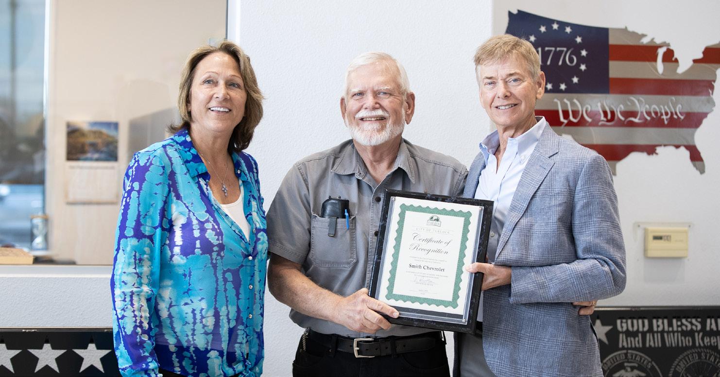 Lee and Larry Smith a certificate in recognition of the business’ 100th anniversary; RIGHT: