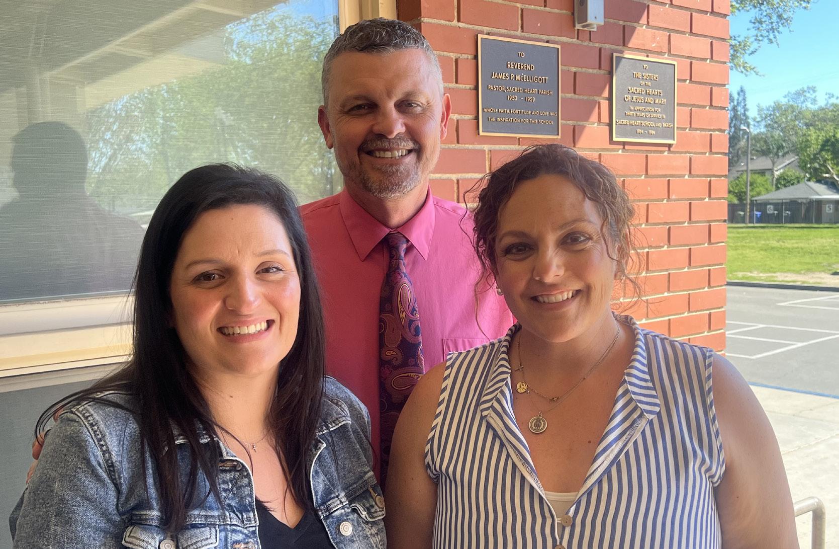 TOP: From left, Sacred Heart School teachers Julia Jennings, Kevin Crivelli, and Angela Roe, are also graduates of SHS; BOTTOM LEFT: Sharolyn (Pimentel) Crivelli was a student when the school first opened in 1954 and was a member of its first graduating class in 1959. Her three younger siblings also graduated from the school. All the Crivelli brothers — Brian, Greg, Mark, Kevin — were Mustangs, and all of their children attended the school.