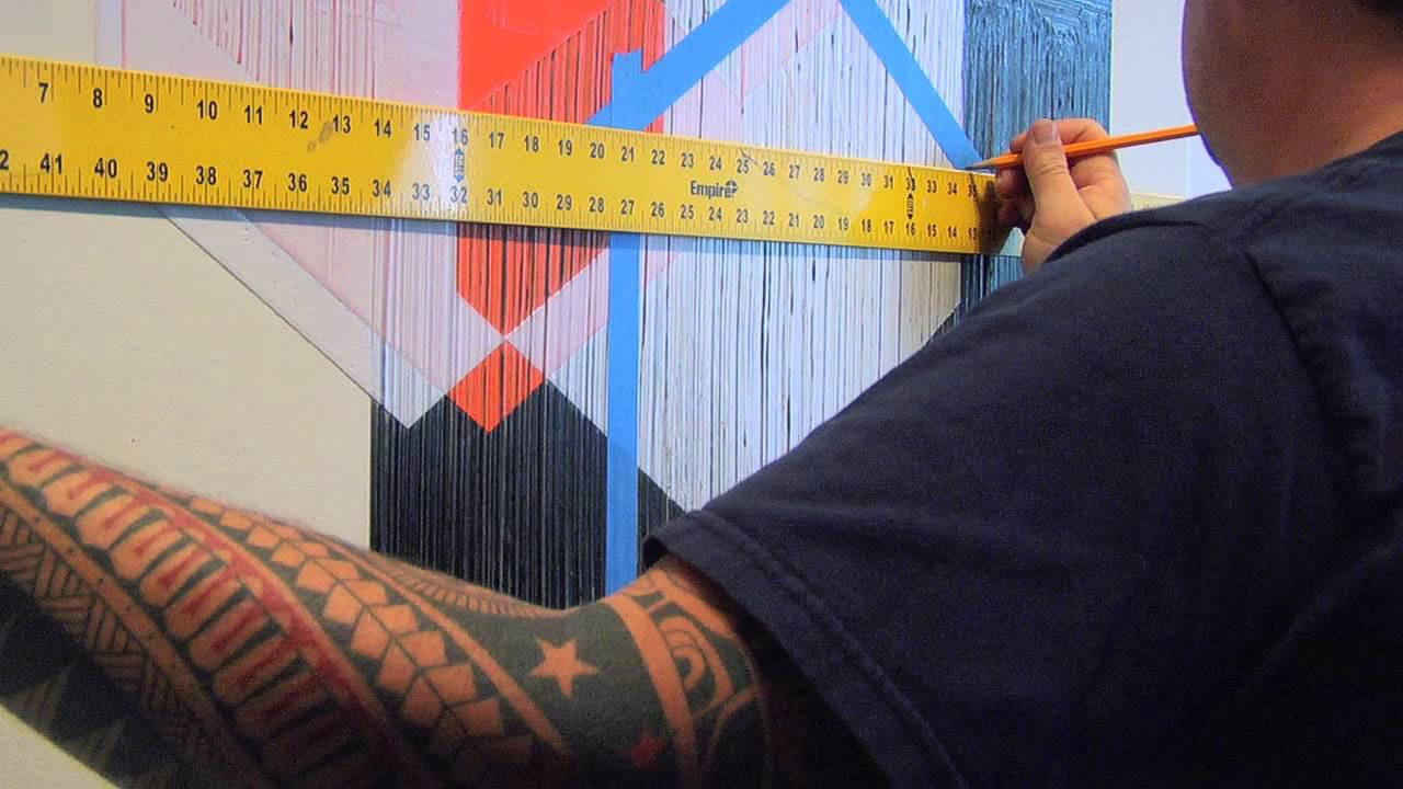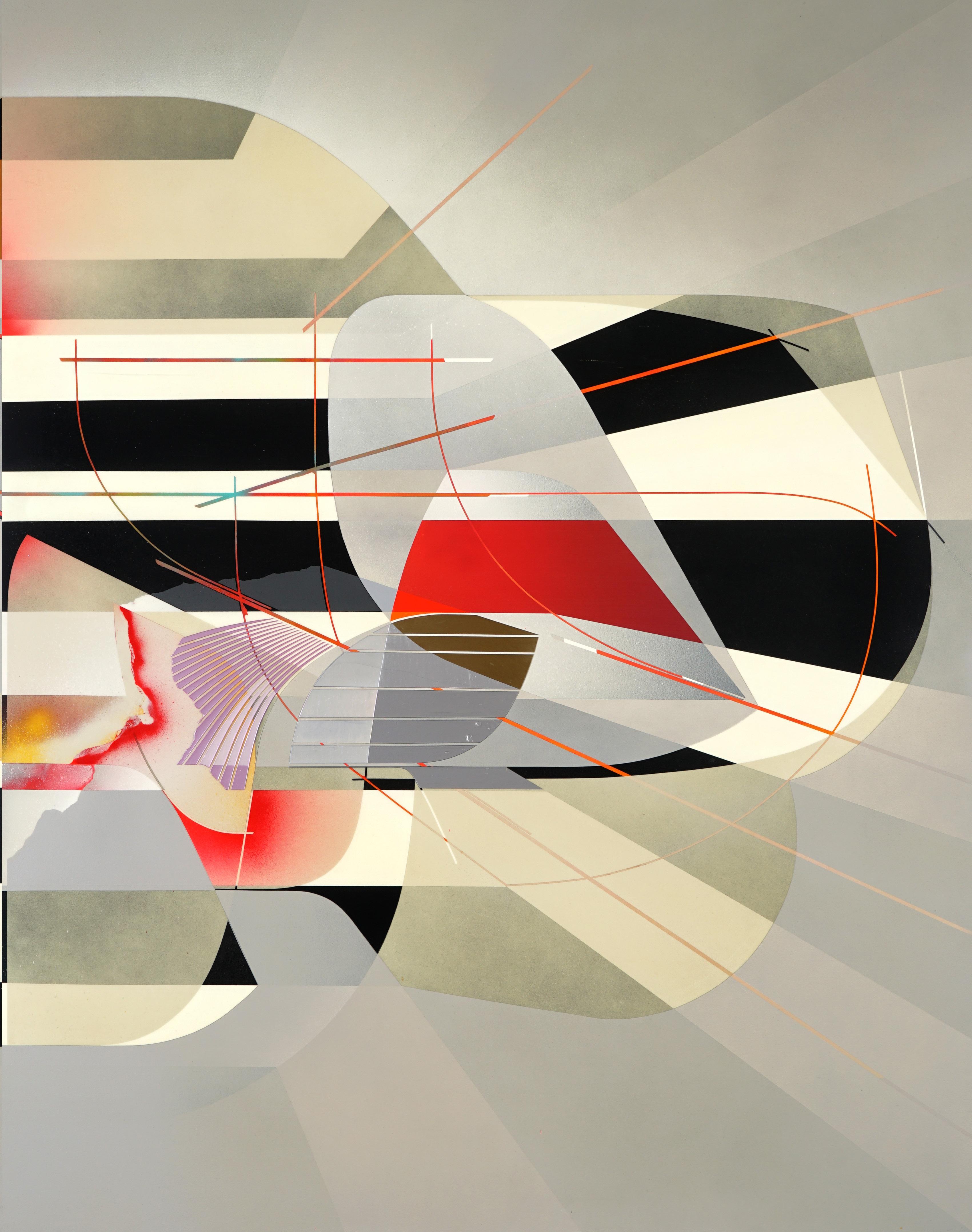 A synthesis of styles and processes particular to the artist’s experience materialize on the canvas to construct the poetics of his investigations. Masking off portions of the painting in his process recalls the batik technique of wax-resist dying and geometric patterning used in his father’s birthplace of Java, Indonesia, a former Dutch colony. His parents met in the Netherlands and immigrated to the U.S., making Couwenberg a first-generation Eurasian American. This synthesis of cultures manifests in his pristine Neo-Plast lines, which disrupt the rigid grid of De Stijl to formulate topsy-turvy cartographies embedded with encoded signsystems. The alternating black-and-white banding alludes to “Invasion Stripes” used by Allied forces to define friendly aircrafts on their fuselages and wings during World War II but can also refer to Chevron stripes. The industrial spray gun is employed to create diaphanous atmospheric effects, where the foreground and background oscillate, while pearlescent paints shimmer on the surface. Couwenberg lacerates striations on portions of the architectonic compositions with tools such as brooms, all the while revealing intersections between the complex networks of positive and negative spaces. These circuits are comparable to the labyrinthine freeways Angeleno’s surmount and the dextrous, freestyle choreographies skaters wreath. Couwenberg orchestrates self-portraits that intimate a collective unconscious unveiled through material and process, ultimately converting them into cultural artifacts.