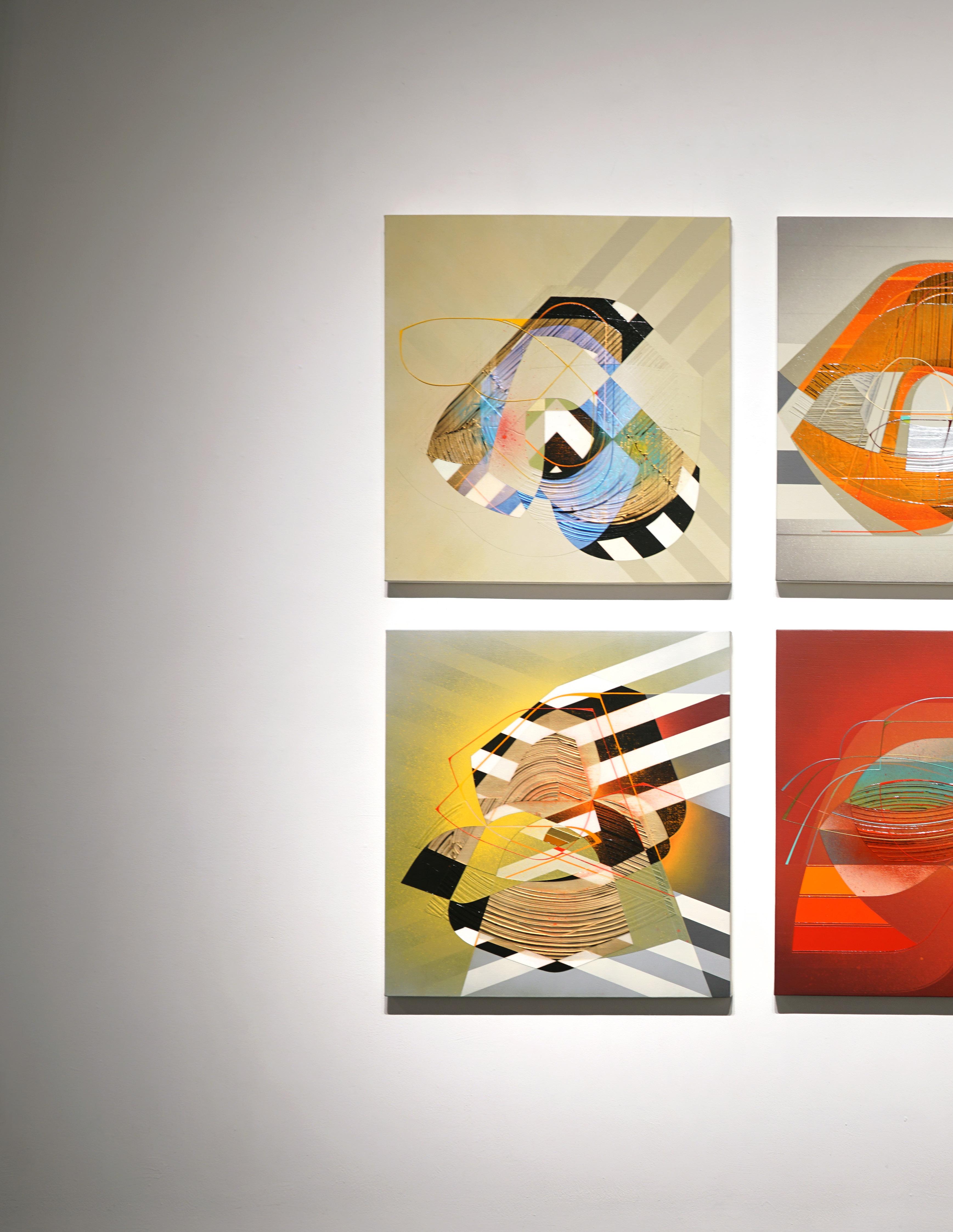 A graduate of The Art Center College of Design and The Claremont Graduate School, Couwenberg worked under the guidance of Karl Benjamin, one of the leading figures in the Southern Californiabased school of Hard-edge geometric abstraction. Beginning in the mid to late 60s, Benjamin was instrumental in developing a highly refined painting style, process, and philosophy of tightly ruled shapes and edges. Concurrently, other artists in LA began working with industrial materials to create highly refined surfaces, termed “Finish Fetish”, and investigating alternative mediums and technological advances. Both of these influences coalesce into Couwenberg’s post-postmodern vernacular, characterized by its layered formal, material, and textured surfaces.