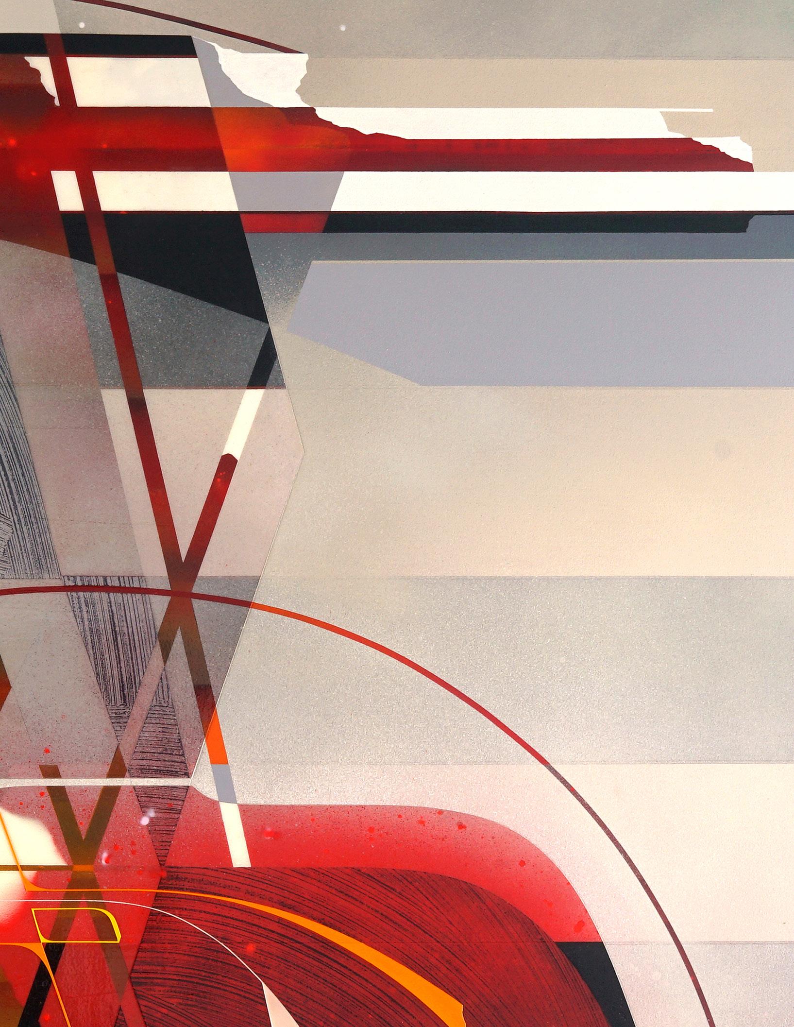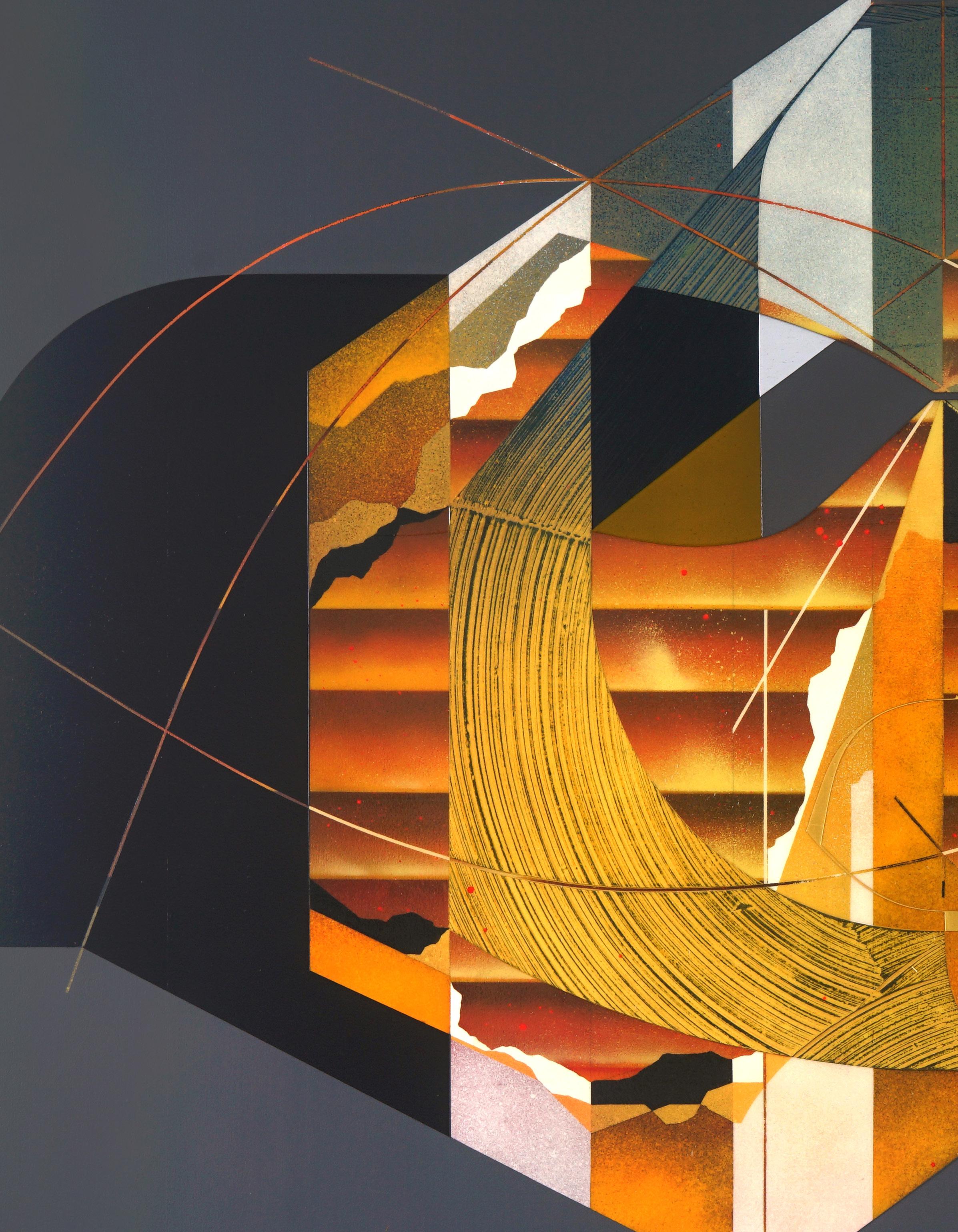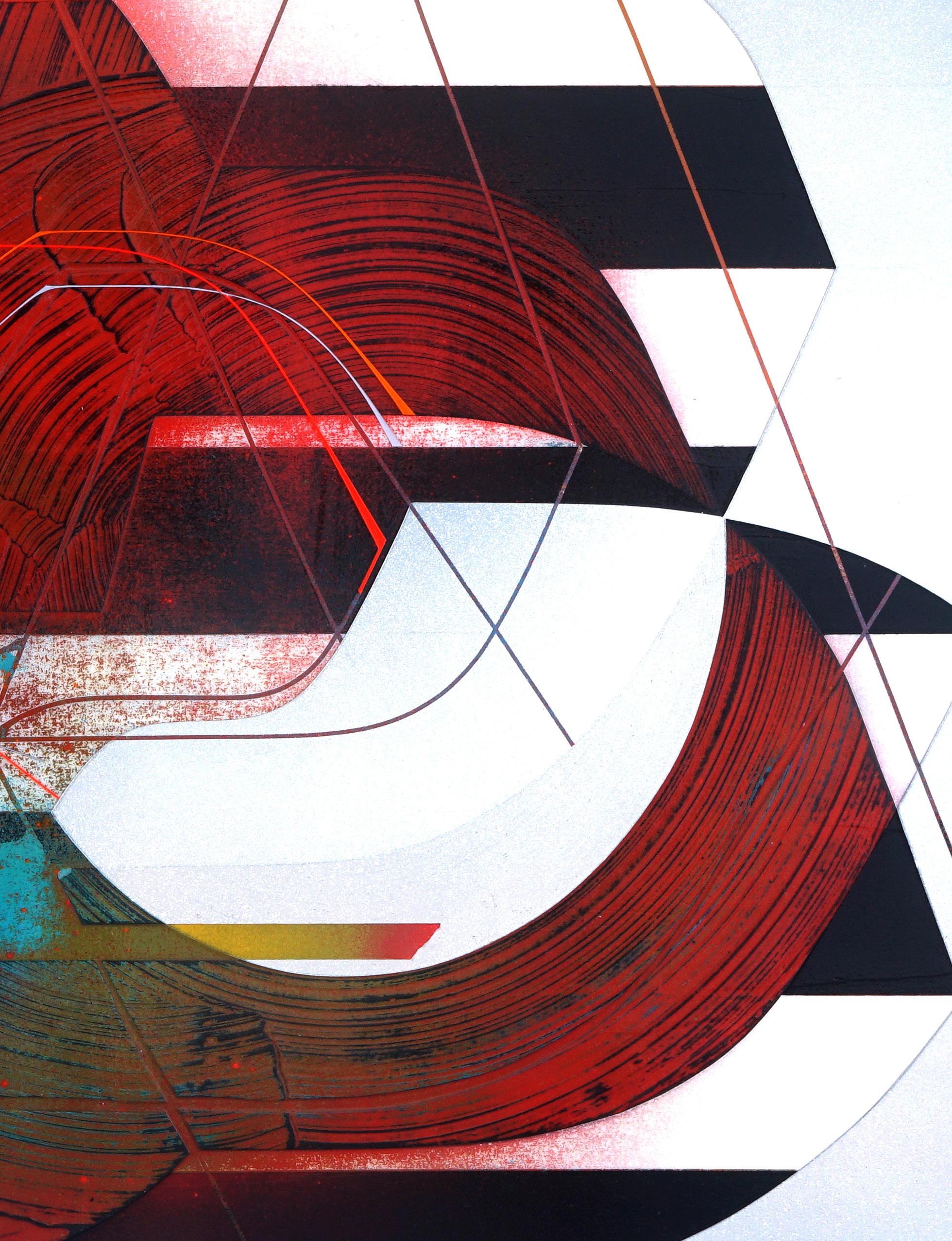 In his latest series, Couwenberg orchestrates an ensemble of color, light, line and texture—each piece a visual improvisation that melds razor- sharp precision with spontaneous intuition. His multilayered canvases pulsate with pearlescent glimmers and atmospheric gradients, where masking, spray techniques and hand - scraped striations reference the sleek contours of ship hulls, car fins and coastal vessels. The forms are in restless motion - shifting, sliding, overlapping - one into the next. Light itself becomes a primary collaborator, dancing across surfaces in harmonic counterpoint to geometric forms and interrupted gridlines.